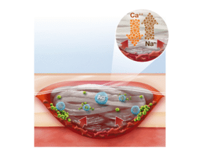 A1. 敷料可吸收傷口滲出物。在吸收過程中,鈉離子與鈣離子發生交換,導致敷料與滲出物接觸後形成凝膠,維持濕潤的傷口環境,支持自溶性清創。此外,釋放的銀離子有助於抗菌功效。